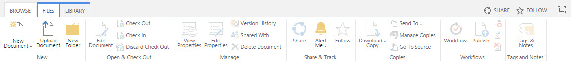 The ribbon is again different when in a document library. In this case, a document is not selected and so the specific document functionality is greyed out. This tells the user that they cannot access it right now. If one or more documents were selected, then the appropriate functionalities would be available such as editing the document or viewing the properties.