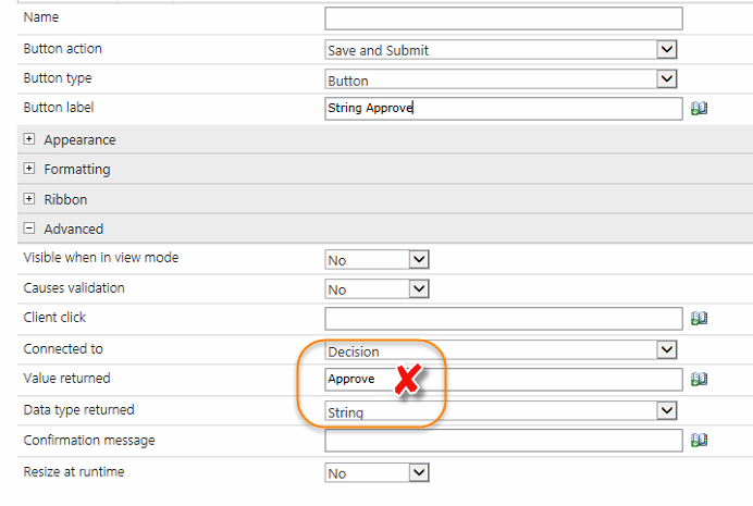 The example below is the “String approve” button. It does save the form, but it does not affect the outcome. Directly referring to the outcome string value does not work.