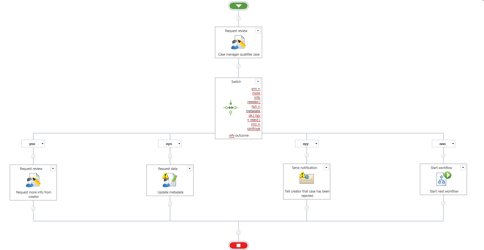 We didn’t handle the loop where the case manager requested more information from the creator, then went through the qualify case workflow again. This could be solved using either a loop or a state machine control. You can read a good overview on Creating flexible, robust Nintex workflows.