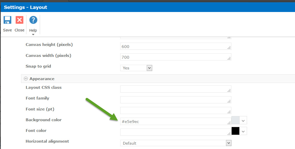 Once you’ve opened the layout settings, you will find the background color property under the appearances header.